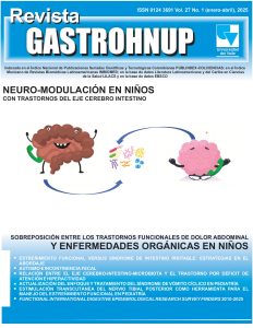 Año 2025 Volumen 27 Número 1Por admin_gastro / junio 9, 2025 2025 ENERO – ABRIL Volumen 27 Número 1 Comité Editorial Contenido Editorial. Velasco-Benítez CA. Celebrando el Conocimiento: 15 Años del grupo FINDERS y el Simposio TECI 2025 . Rev Gastrohnup 2025; 27 (1): 3-4 1. González N. Neuro-modulación en niños con trastornos del eje cerebro intestino. Rev Gastrohnup 2025; 27 (1): 5-8 2. Mejía M. Sobreposición entre los trastornos funcionales de dolor abdominal y enfermedades orgánicas en niños. Rev Gastrohnup 2025; 27 (1): 9-13 3. Higuera MM. Estreñimiento funcional versus síndrome de Intestino irritable: Estrategias en el abordaje. Rev Gastrohnup 2025; 27 (1): 14-20 4. Fernández J. Autismo e incontinencia fecal. Rev Gastrohnup 2025; 27 (1): 21-26 5. Salvador A. Relación entre el Eje Cerebro-Intestino-Microbiota y el Trastorno por Déficit de Atención e Hiperactividad. Rev Gastrohnup 2025; 27 (1): 26-28 6. Zablah R. Actualización del enfoque y tratamiento del síndrome de vómito cíclico en pediatría. Rev Gastrohnup 2025; 27 (1): 29-33 7. Velasco-Suárez DA, Velasco-Benítez CA. Estimulación transcutánea del nervio tibial posterior como herramienta para el manejo del estreñimiento funcional en pediatría. Rev Gastrohnup 2025; 27 (1): 34-36 8. Velasco-Benítez CA. Functional International Digestive Epidemiological Research Survey – FINDERS 2010-2025. Rev Gastrohnup 2025; 27 (1): 37-48 Indicaciones a los autores Política Editorial